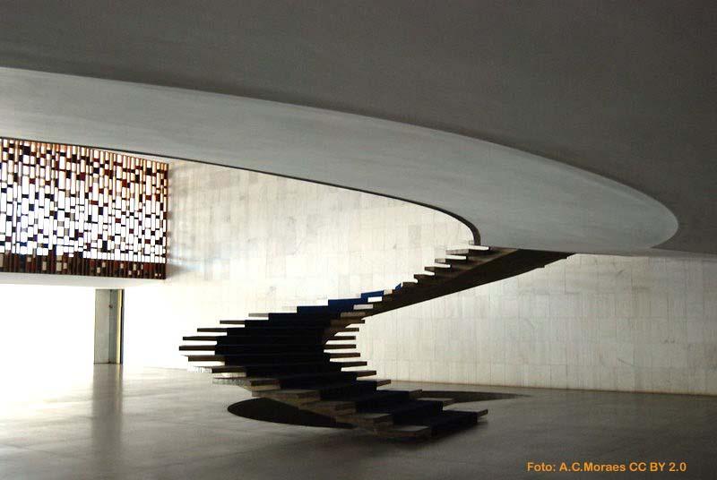 Oscar Niemeyer a construit această minunată sculptură din Palatul Itamaraty (Palatul Arcelor) - sediu al Ministerului Afacerilor Externe din Brazilia - în 1970. Maestru al utilizării betonului aparent în clădiri, Niemeyer s-a jucat cu formele, cu spațiul, modelându-l la limita incredibilului; ca în celebra glumă ”acest animal nu există”, scara uluitoare din beton armat aparent, pe vang central și cu trepte de o simplitate, eleganță și zveltețe aproape ireale mobilează încăperea confirmând, dacă mai era nevoie, că scara în sine nu este doar un element tehnic, de asigurare a circulației pe nivelurile diferite ale unei clădiri ci o sculptură monumentală, la scara spațiului în care este amplasată.